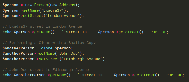 When we clone an object, that contains other objects is important to keep in mind that the objects stored in the properties of the object being cloned will stay as references to the original object, by other words will not be cloned, thus any change in this objects will have a direct reflex on the original object. This type of Clone is called a Shallow Object Copy. So we can control what happens when an object is cloned by implementing the method __clone() and inside of it we will ensure that all properties containing another object will contain also a clone of that object.